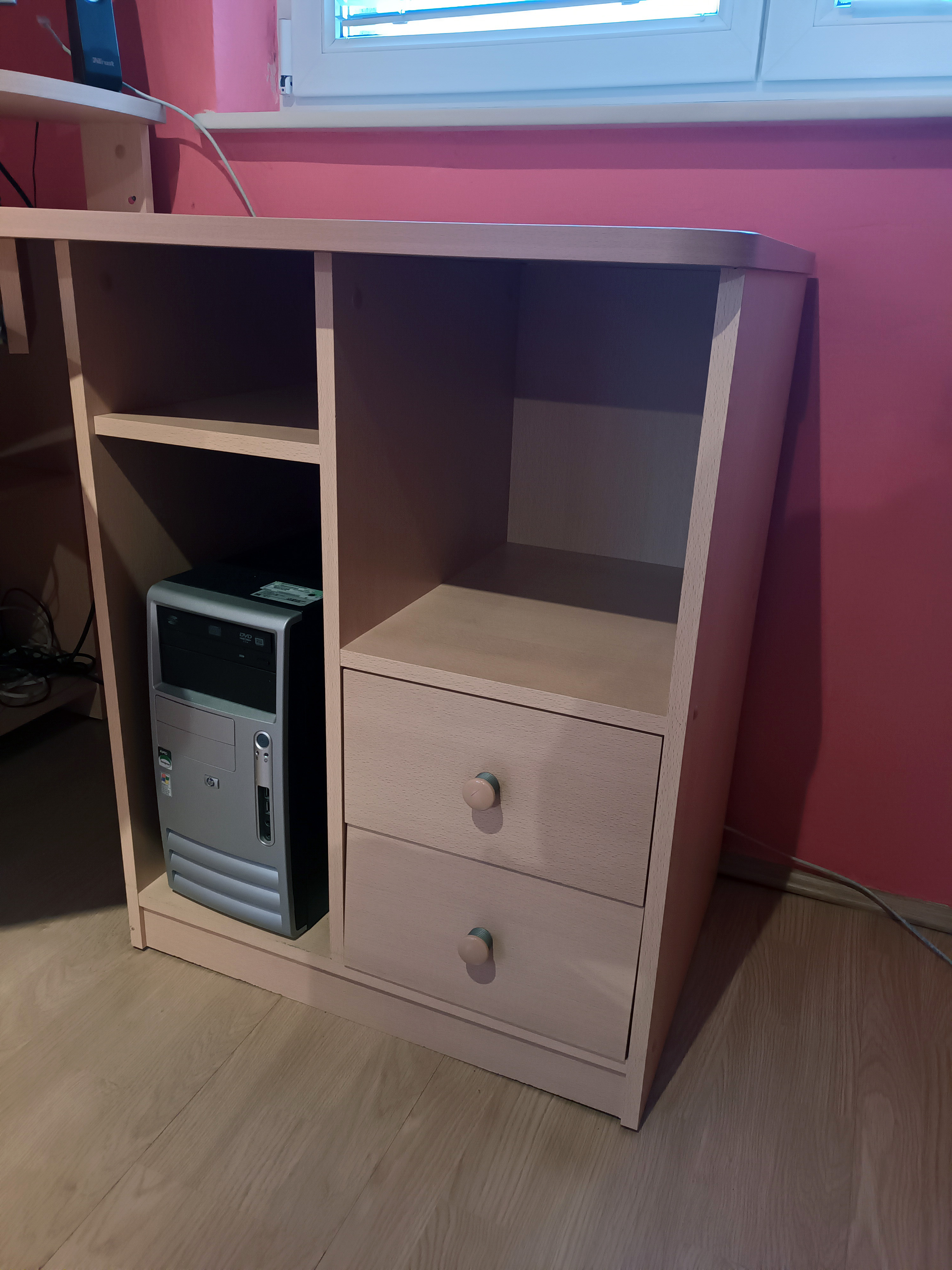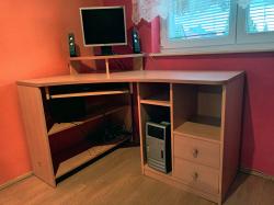 Perfektně zachovalý psací/počítačový stůl. Hodí se jak pro studenty, tak pro pracanty. Dřevotříska, barva světle hnědá, výška 78,5 cm, delší šířka stolu 135,5cm a kratší šířka stolu 95cm. Pro monitor je speciální polička, takže na něho dobře uvidíte. Klávesnici umístíte do výsuvné poličky. Všechny potřebné sešity či dokumenty uložíte do šuplíků nebo poliček.